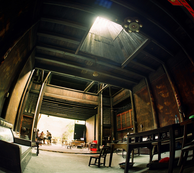 院內(nèi)廂房按家室的輩分依次居住。廂房的木窗雕龍刻鳳,每一板雕刻都是一個美麗的傳說。其中《梁?!?、《天仙配》、《蚌殼燈》、《彩龍船》、《鼠叼葡萄》、《老鷹抓雞》等雕刻更是入木三分,惟妙惟肖。樓上則主要用于囤積貨物,擺放雜物、晾曬衣物等。后側(cè)建有伙房和廁房,院落后部則是花園,花園的盡頭緊連著河邊的私家碼頭。