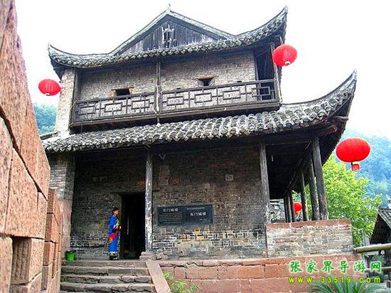 東門城樓始建于清康熙五十四年(1715年),城門下部由紫紅砂巖砌成,上部城樓則用古磚砌筑。城門寬3.5米,高4米,呈半圓拱,兩扇城門都用鐵皮包裹,用圓頭鐵釘密釘,牢實堅固。城墻修筑全部用紅砂條石,精工細(xì)鉆,規(guī)格一致,城墻厚0.8米,下部內(nèi)外兩側(cè)用條石加石灰漿砌成,中間填以碎石粘土,層層夯實;頂部的中間填充物改為石灰、鵝卵石、黃土拌成的三合土,厚約0.33米,上面鋪以紅砂塊石。城樓高11米,大門上方有槍眼8孔。歇山屋頂,覆以腰檐,飛檐翹角,精美壯觀。