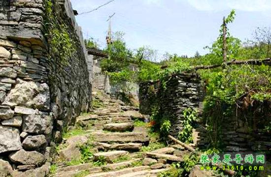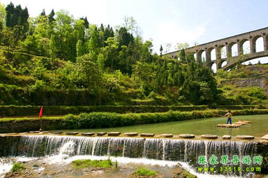 寨前阡陌縱橫,溪流交錯(cuò),九曲迂回,水邊是排排水車、石碾,水里是整塊整塊的天然青巖板,出水為洲,入水為瀑,并形成許多奇特階梯瀑,水上是一道道巖板堰,堰上是一道道形態(tài)各異的跳巖,水溝上橫著塊塊巨大的巖板橋……山水田園與水車、水碾、巖板堰、巖板橋、跳巖相互輝映,構(gòu)成一幅幅絕妙畫卷。