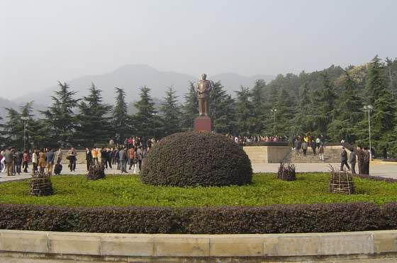 毛澤東銅像位于韶山沖的中心,紀(jì)念館、毛氏宗祠與韶山賓館之間。銅像區(qū)占地5200平方米,是經(jīng)中共中央批準(zhǔn)興建紀(jì)念毛澤東同志誕辰100周年的重點(diǎn)獻(xiàn)禮工程。這里原是一片沃野,地勢(shì)平坦開闊,周圍群山拱護(hù)。韶蜂在遠(yuǎn)處,高峻挺拔,云富坨大山巍峨雄壯,十八羅漢山逶迤綿長(zhǎng),黑石寨鐵骨錚錚。在山的襯托下,銅像更顯得氣勢(shì)磅礴。