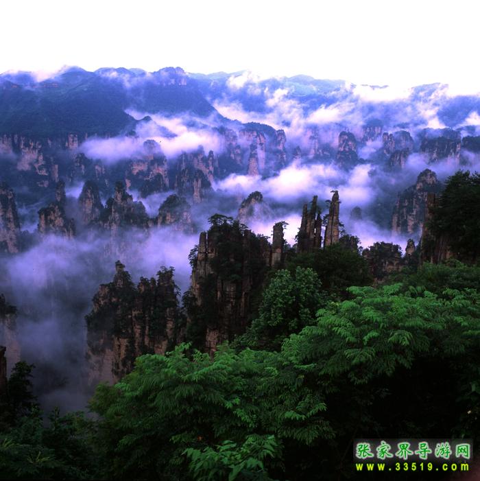 武陵源獨特的石英砂巖峰林在均屬國內外罕見,在360多平方公里的面積中,目前所知有山峰3000多座,這些突兀的巖壁峰石,連綿萬頃,層巒疊嶂。每當雨過轉晴或陰雨連綿天氣,幽幽山谷中生出了云煙,云霧飄緲在層巒疊嶂間,云海時濃時淡,石峰時隱時現(xiàn),景象變幻萬千。霧,使晴日下堅硬的山峰變得妖嬈、飄逸和神秘。觀霧的最好季節(jié)是夏季,天子山是賞霧的最佳去處,也是攝影家常常涉足的地方。