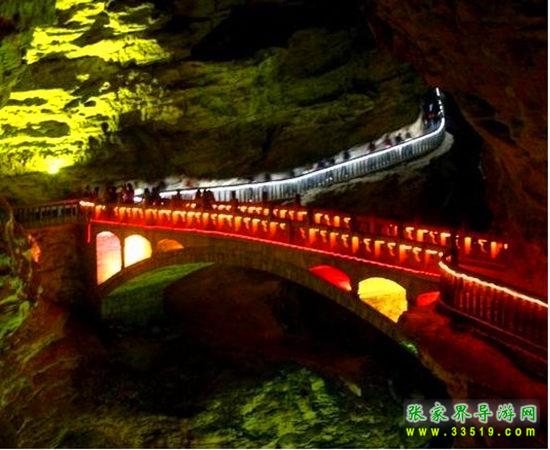 橋長(zhǎng)22米,橋面寬3米,距水面17米,這是我國(guó)游覽洞穴中最大的石拱橋,是為迎接1995年國(guó)際溶洞會(huì)議在黃龍洞召開(kāi)而修建的。橋的欄桿全部用當(dāng)?shù)氐?ldquo;土特產(chǎn)”木紋石建造。