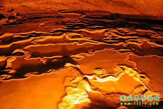 “黃‘龍’之水天上來(lái)”,這里洞頂與外界僅一層薄薄的巖石相隔,天上雨水匯集起來(lái)滲透巖層便形成黃龍洞內(nèi)流量最大的一股泉水——天仙水,其落差達(dá)27.3米。“飛流直下三千尺,疑是銀河落九天”,誰(shuí)能想象洞中竟有這樣雄偉壯觀的瀑布?天仙水下面是層層疊疊的石梯田,連綿起伏,有人說(shuō)這是龍王爺?shù)娜f(wàn)頃良田。