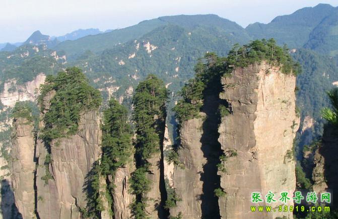 黃石寨西北崖沿下,6座高達(dá)200多米的橢圓形石柱,呈南北向一字排開在黃石寨與袁家界之間約2000米長的溝谷中。石柱大小和間距相當(dāng),柱頂皆為平臺,似一派待建橋面的橋墩。中間兩墩稍高,兩邊漸次降低。各柱頂可連成一條弧線,氣勢恢宏。橋墩下河床干涸,怪石嶙峋,樹木依稀,顯得古野、蒼涼。雨天,云霧滿壑,似一江怒濤,橋墩時(shí)隱時(shí)現(xiàn)。若逢東邊日出西邊雨時(shí),便有絢麗壯闊的彩虹南北飛架,與橋墩形成雙美合壁的奇觀。