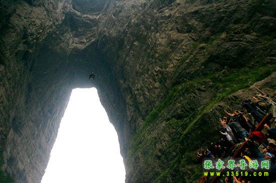 雄偉高大。清人王子睿詩(shī)曰:“推得石門開,去天才五尺”。天門洞高131.1米,寬30米,深37米,可容納300人,可修建一董16層高的樓房。清代一 知縣李瑾站在永定衛(wèi)城的上觀望,只見“巖竇半吞清夜月,山阿常宿隔霄云”。此時(shí)的天門洞,把月亮吞去了一半。