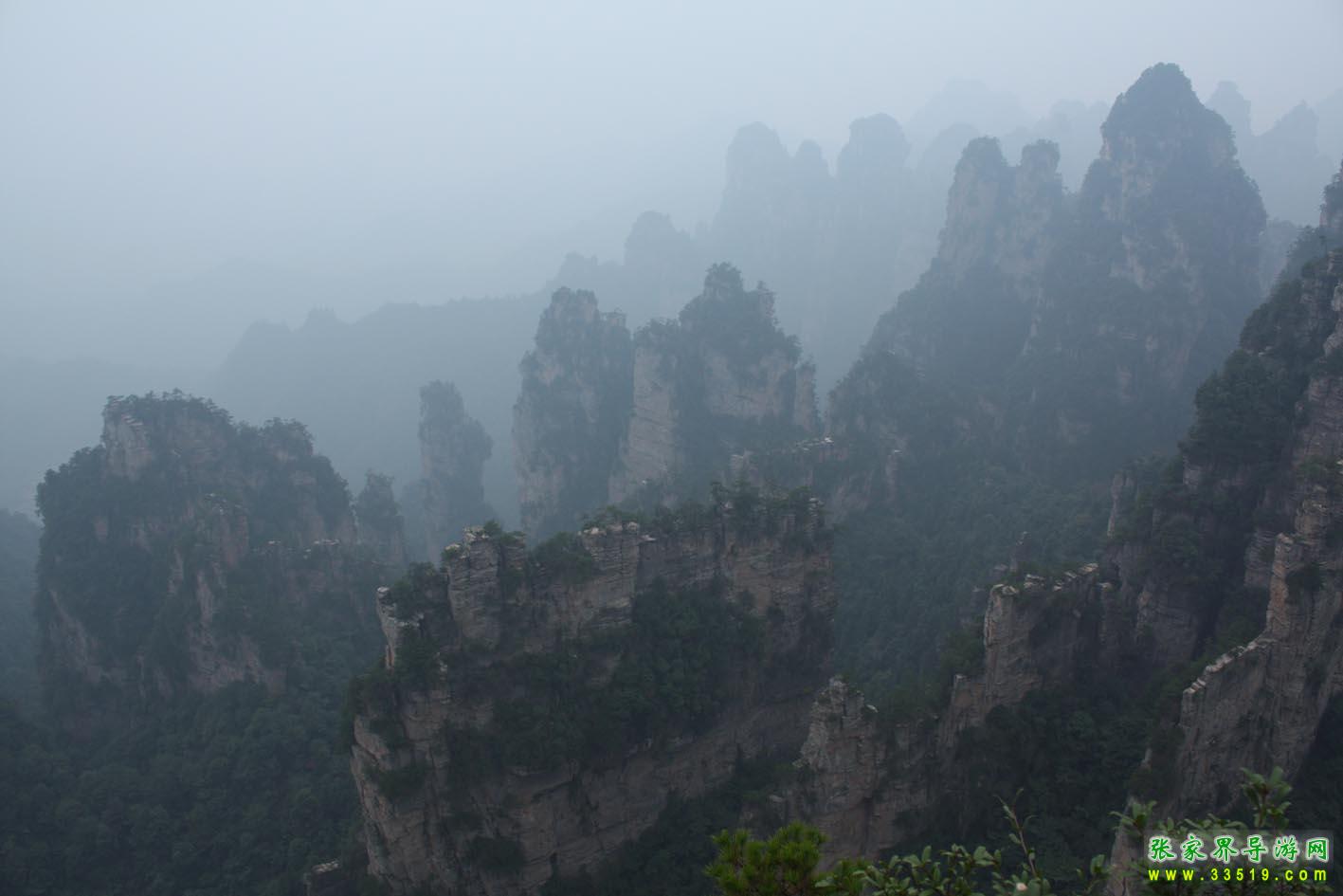 自乾坤柱觀景臺向西轉(zhuǎn)過一彎,有頂端平整的巖嘴突出崖沿6米左右,臨絕壁半面有四個邊長相等的天然鈍角,銀灰色銅管欄桿圍護,左右石凳排列,別致而高雅。憑欄極目,遠(yuǎn)處六巨峰兩兩相對,排列成陣,頂天立地,氣勢磅礴。另有兩峰如屏,橫斷天際。兩峰屏、六峰柱之間的谷中,四座瘦長石峰次第而下,自遠(yuǎn)而近,由高到低,連成一線,長達兩千多米,有如梯級。在這四座瘦長石峰中上部,另有兩巨峰偎依,渾圓如柱。據(jù)說是如來佛伸出的兩根指頭,其用意如何,至今無人能解。其下有巨石構(gòu)成的天然神殿,如雨后晴明,殿內(nèi)佛像依稀可見。右側(cè)一峰頂部似靴,據(jù)說是登“步步高”上天梯的神人走得匆忙,遺忘一只在此。攀欄俯視,300多米深的絕壁根前,有兩排峰體如古城門,八字排列,墻壁斑駁陸離,古野凄涼。古城門與步步高天梯相聯(lián)成趣:昔人拾級登天去,此地空余古城門。“昔人”是誰?“古城門”建于哪朝哪代?留與后秀破解。這里雖有諸多疑團使人困惑,但是充滿幽野之美,引人入勝。