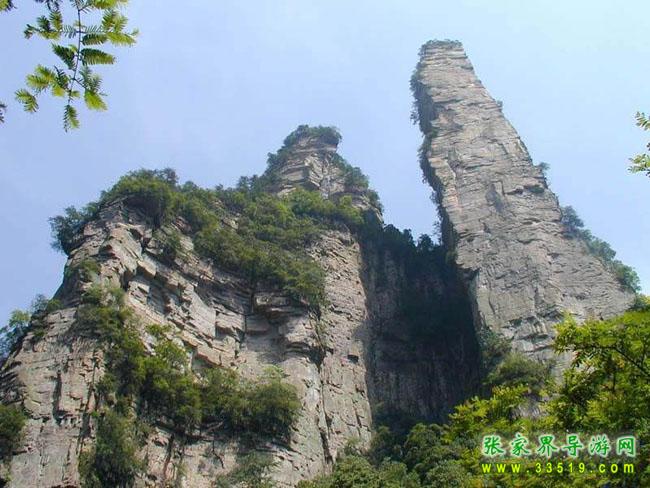 與金鞭巖隔溪對(duì)峙,矗立在斜坡上,高200余米。上下粗細(xì)一般,峰體渾圓,色赤,呈70度角向金鞭溪傾斜,形似醉酒羅漢,欲倒不倒,似醉非醉,詼諧幽默。清嘉慶學(xué)士彭之臣在峰壁書(shū)寫(xiě)一“忠”字。清道光四年(1824),貢生彭之運(yùn)作《壁忠記》譯文以彰其勝。風(fēng)雨蒼桑,“忠”字因山石崩塌遭毀,《記》存于當(dāng)?shù)刂緯?shū)中。