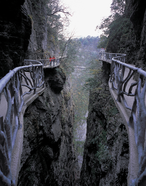 站在棧道上俯瞰群山,古人“會(huì)當(dāng)凌絕頂,一覽眾山小”的感覺(jué)油然而生。由于天門(mén)山是國(guó)家森林公園,植被特別豐富,加上典型的喀斯特地貌,所以,在這條棧道上更能找到一種在乘坐直升飛機(jī)飛越熱帶雨林大峽谷的感覺(jué),這平時(shí)只能在電影里看到的場(chǎng)景,在這里能讓你身臨其境。