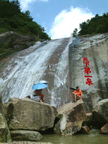 水簾洞瀑布源頭,在紫蓋峰的泉水。三支泉水匯集一起,流入水簾洞上方谷地。谷地闊三丈,原是梁朝的九位真人白日飛升的棲息之地,后建造九仙觀。九仙觀附近有太陽泉、洗心泉、洞真源、仙人池等。相傳泉水深不可測。泉水從石壁上飛流直瀉,發(fā)出雷鳴般的聲音,聲傳十里。明朝張居正游此地后說:“瀑泉灑落,水簾數(shù)疊,掛于云際,垂如貫珠,霏如削玉”。確實,它從絕壁上噴瀉下來,寬達三太,高五十余米,瀉珠濺玉,仿佛一幅巨大的白布簾,在石壁當(dāng)中被亂石嶙巖擋住,然后再從石縫里屈曲折射,跳躍出來,滿谷水花四濺,閃爍著晶瑩奪目的光彩。水簾絕壁下的碧潭,天上的云彩和兩邊的蒼翠的山巒,構(gòu)成一幅美麗的山水畫。明朝張居正作《水簾洞》一贊道:“誤疑瀛海翻瓊浪,莫擬銀河倒碧流;自是湘妃深隱處,水晶簾掛五去頭”。這首詩可說是寫出了水簾洞的光、聲、影三絕的奇景了。