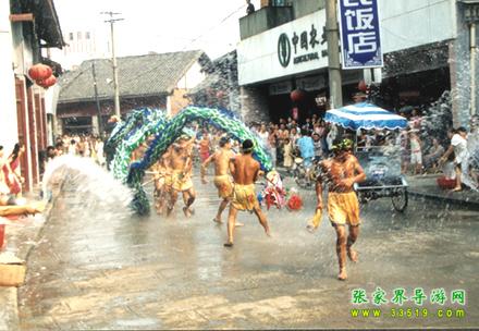 張家界潑水龍又叫“澆水龍”,于唐朝時(shí)期由移居本地的白族興起演變而成,在永定區(qū)的尹家溪鎮(zhèn)西尹村、莫家崗村十分盛行,是當(dāng)?shù)?a class="insidelink" href="http://www.mriyar.com/fengqing/" title="土家族">土家族,白族、苗族在天熱干旱時(shí)節(jié)求雨祈福的一種形式。一旦出現(xiàn)旱災(zāi),當(dāng)?shù)仡^面人物就會(huì)出來組織潑水龍,演出極其隆重。