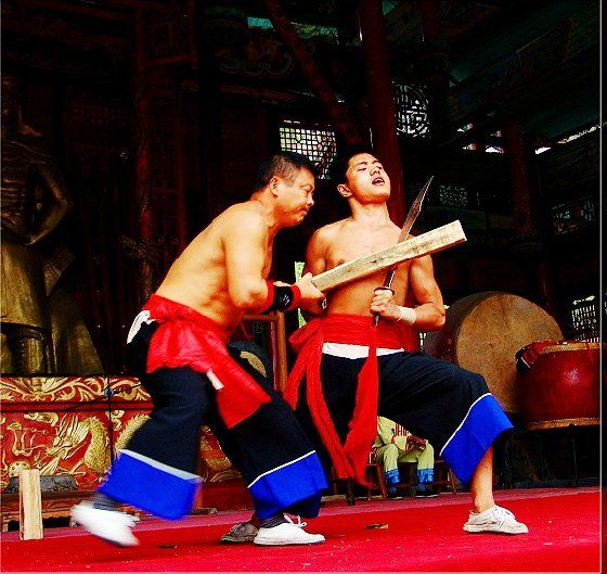 大庸氣,堪稱武林奇葩,曾為祖國贏得聲譽(yù),海內(nèi)外享有極主名望。 大庸氣功是大庸各民族特別是土家族傳統(tǒng)體育項(xiàng) 目之了,分健體氣派、武術(shù)氣功兩類。前者有“返還 功”、“馬王推氣功”、“少林達(dá)摩醫(yī)療保健氣功” 等;后者有靜坐、壁虎、靈子、二指彈、碎石、松靜 、硬氣、五禽、五陽功等,尤以硬氣功著稱。大庸硬 氣功,歷史悠久,漢代相單程,明代覃后,清代劉明 燈,當(dāng)代湯子模、周鐵鞭、杜心武、趙繼書等都具有 超人硬氣武功。大庸土著民族在漫長的反征服、反壓 迫斗爭(zhēng),博采武當(dāng)、少林南北派、昆侖派眾家武林精 華,創(chuàng)造出獨(dú)此一家的大庸硬氣功。 據(jù)傳,大庸硬氣功鼻祖是楚國鬼谷子?!队蓝h 志》有關(guān)鬼谷子隱居天門山鬼谷洞潛心學(xué)《易》、傳 授方術(shù)的記載。到清代有武林高手朱茂嶺,隱居三岔 村北芭蕉灣洞,研究鬼谷氣功之術(shù),后收西溪坪胡口 子、余世萬(即“余通人”)為徙,傳其衣缽。余通 人將武術(shù)氣功系統(tǒng)整理,發(fā)揚(yáng)光大,播名于世。 新中國成立后,黨和政府十分重視民間氣功發(fā)掘 整理,并正式列為體育項(xiàng)目加以普及發(fā)展,今日大庸 市習(xí)練硬氣功達(dá)數(shù)萬人眾。永定區(qū)官黎坪村世有“硬 氣功之鄉(xiāng)”盛譽(yù),該村男女老幼,練功已蔚成風(fēng)氣, 其武師趙繼書,1979年先后參加全省和全國武術(shù)大賽 ,均獲一等獎(jiǎng),受到國家體委重視,同年7 月趙繼書 專程到北京給中央領(lǐng)導(dǎo)同志匯報(bào)表演。嗣后,隨同中 國武術(shù)代表團(tuán)和國家領(lǐng)導(dǎo)人先后兩次出國,到盧森堡 、意大利、比利時(shí)、羅馬尼亞、馬其他和東南亞等國 家訪問。他表演的臥刀碎石、頭頂開石、雙鳳灌耳、 頭碰石柱、叉尖推磨等精彩節(jié)目,博得外國友人好評(píng) 。盧森堡一位榮獲國家獎(jiǎng)牌的武士,看了表演后連夜 來到中國大使館,將自己珍藏多年的獎(jiǎng)牌贈(zèng)送給他; 盧森堡國王主動(dòng)熱情走上臺(tái)與趙繼書熱情擁抱,連連 稱贊:“了不起!了不起!國際氣功大師!”并把珍 藏紀(jì)念章一枚贈(zèng)送給趙繼書。一位法國朋友十分贊賞 說:“中國的氣功,稱為全人類的寶貴財(cái)富,是有科 學(xué)道理的。”自此,大庸硬氣功譽(yù)滿全球。湖南瀟湘 電影制片廠專門拍攝了彩色紀(jì)錄片《大庸氣功》。 大庸硬氣功共有二十多個(gè)項(xiàng)目,最有影響的是: 腹臥鋼叉 由二人在地面扶住一根叉尖朝上的三 股鋼叉,叉尖猁鋒利,然后一個(gè)俯身叉尖,尖抵腹部 ,待其四肢平展懸空,扶叉二人轉(zhuǎn)動(dòng)鋼叉,謂之推磨 。表演時(shí),要求臥叉者運(yùn)氣于腹,氣意集中,稍有大 意,叉即穿腹而過。 臥刀破石 先固定兩把大刀,刀口朝上,臥刀者 運(yùn)氣后,由其他人抬臥于刀口上(有仰臥、俯臥兩種) ,然后在臥刀者腹部或背部置一碩大石條(約數(shù)百斤) ,一人或兩人輪大鐵錘狠擊石條直至斷裂破碎為止。 釘?shù)洞财剖?地上倒一層碎玻璃片,一人仰臥其 上;然后腹上置釘床,又一人仰臥釘床上,再于第二 人腹上置釘床,第三人仰臥刀床上,腹部上壓一塊數(shù) 百斤大條石,由人掄錘狠砸,至石破為止。 銀槍刺喉 用一根兩頭安有鋒利槍頭的鋼槍,抵 置兩位表演者喉部,然后相對(duì)發(fā)力,至槍桿抵成彎弓 形而喉部安然無恙。 徙手?jǐn)嗍?表演者將堅(jiān)滑如鐵一塊卵石置于石凳 (地)上,然后運(yùn)氣于掌或指擊斷(碎)卵石。 踢腿斬石 表演者運(yùn)氣于腿,以腿踢斷石條。一 般可踢斷15公分以上厚度的麻石條或青石條。 胸部打刀 將鋒利大刀刃口置于胸部肌肉上,用 一根拳頭粗木棒猛擊刀背,至棒斷而胸部無傷。 新中國成立以來,大庸民間武術(shù)與民族體育逐漸 融為一體,發(fā)揮著提高人民身體素質(zhì)、弘揚(yáng)中華武術(shù) 傳統(tǒng)和增進(jìn)國際友誼重大作用。除硬氣功外,還有數(shù) 十種武術(shù)形式散見于民間武術(shù)體育活動(dòng)之中。如打飛 棒、扭扁擔(dān)、抵搭斗杠、擠油渣、甩抱腰、舉石鎖、 板牛角(一種斗牛形式)等等。其特點(diǎn)是因地制宜, 不分場(chǎng)地,凡田園地角院壩集鎮(zhèn),都是習(xí)武練功、開 展活動(dòng)的處所,頗具泥土氣息。擬或以生活中某些動(dòng) 作和動(dòng)物的某種形態(tài),稍加模仿演繹,便成某一獨(dú)特 武術(shù)形式。如天門武術(shù)功夫大師余道人所創(chuàng)造的“宮 天梳”、“巖燕樸天門”等;也有就地理特點(diǎn)創(chuàng)造某 種武功形式的,如“蕩藤”等。