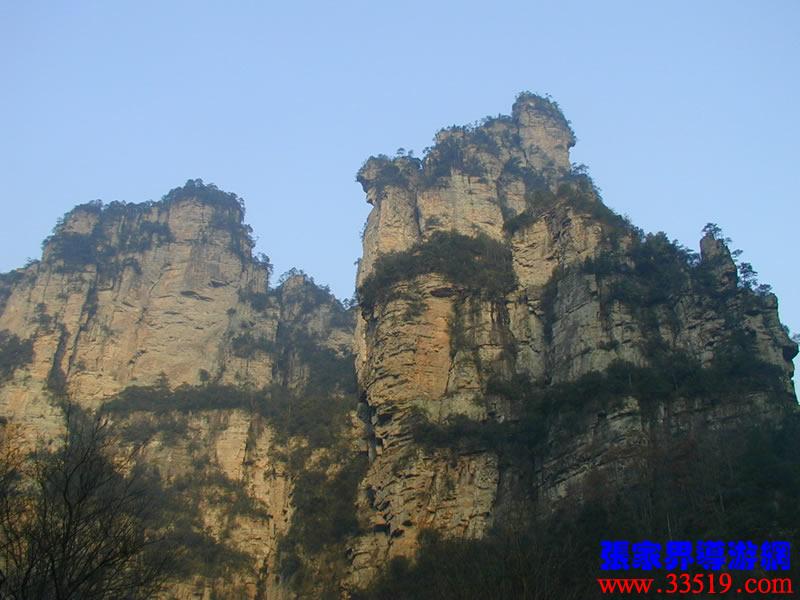 (金鞭巖、神鷹護(hù)鞭)如果要問(wèn)張家界國(guó)家森林公園的標(biāo)志景點(diǎn),答案是現(xiàn)成的:金鞭巖。早在清代中期,一些文人就把張家界的峰林及百丈峽列入“永定八景”。其一叫“危峽啼猿”;其二叫“層巖涌塔”:“縣西二十里青崖山,其前五山并立,層峙如浮圖。中一峰更峻拔,上插宵漢,晴輝雪積,最擅奇觀。”這里說(shuō)的“其中一峰”,指的金鞭巖。八大景點(diǎn)張家界占其二,可見(jiàn)先人是有眼力的。金鞭巖相對(duì)高度380多米,拔地而起,直插云霄,無(wú)論你遠(yuǎn)看近看,正看側(cè)看,都是一根刺破青天的長(zhǎng)鞭!在金鞭巖左側(cè)的那座巖峰,大家看多像一只兇猛的老鷹,勾嘴瞪眼,雙翅略展,時(shí)刻警覺(jué)地守護(hù)著金鞭,人稱“神鷹護(hù)鞭”。