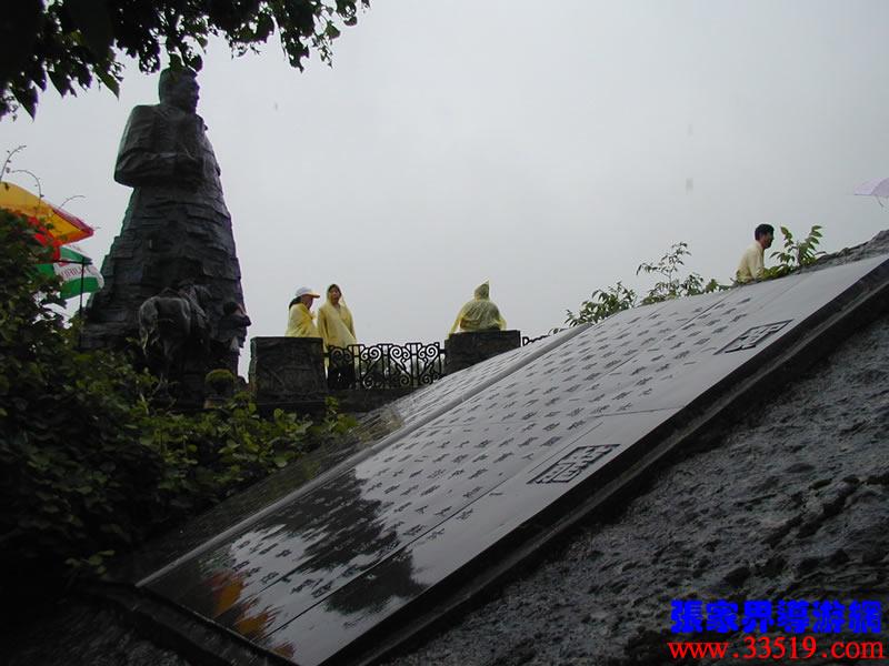 (賀龍銅像)賀龍?jiān)獛浭侵腥A人民共和國(guó)的開(kāi)國(guó)元?jiǎng)祝嗣窠夥跑姷木喸煺咧?。他就出生在天子山西邊桑植縣洪家關(guān)的一個(gè)農(nóng)民家庭,從兩把菜刀砍鹽局首義起,一生充滿(mǎn)傳奇色彩,元帥家鄉(xiāng)流傳著無(wú)數(shù)關(guān)于他的故事與傳說(shuō)。天子山一帶曾經(jīng)是賀龍、任弼時(shí)、肖克、王震等將軍打過(guò)游擊的地方。一回,賀龍?jiān)阼尮乃幻駡F(tuán)包圍了,當(dāng)?shù)乩习傩占敝猩?,把賀龍卷在斗墊里,躲過(guò)了殺身之禍。這個(gè)故事至今還在這一帶流傳。