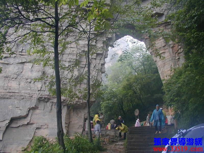 (南天門(mén))大自然的造化真奇妙,利用一塊巨大的板狀石峰鑿出一扇大門(mén),底寬10余米,高15米。相傳當(dāng)年屈原登天臺(tái)問(wèn)天,就是從這里經(jīng)過(guò)的,故民間叫它“通天門(mén)”。據(jù)說(shuō)向王天子在水繞四門(mén)苦練三年零六個(gè)月武藝,起事那天,就是立在這兒向皇宮連射三箭,流傳在武陵源民間的“三箭射皇宮”的典故就從此來(lái)。