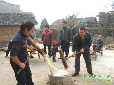 土家人民素有“二十八,打粑粑”的說法。每逢春節(jié)來臨,農(nóng)歷臘月末,家家都要打糯米糍粑,所謂打糯米糍粑,據(jù)當?shù)剜l(xiāng)土志書記載:“系糯米飯就石槽中杵如泥,壓成團形,形如滿月。大者直徑約尺5,尋常者約4寸許,3至8分厚不等。”打糯米糍粑是一項勞動強度較大的體力活,一般都是后生男子漢打,兩個人對站,先揉后打,即使冰雪天也要出一身汗。做粑粑也很講究,手粘蜂臘或茶油,先出砣,后用手或木板壓,要做得玉圓光滑,講究美觀。