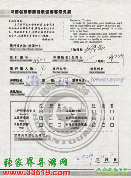 2009年11月14日劉先生一行9人旅游接待質(zhì)量反饋單: