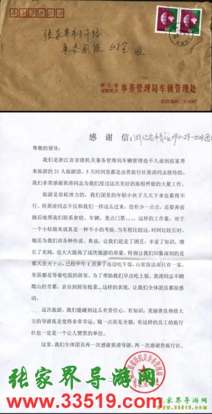 浙江省省級機關(guān)事務管理局車輛管理處致張家界康泰國旅導游黃濤感謝信