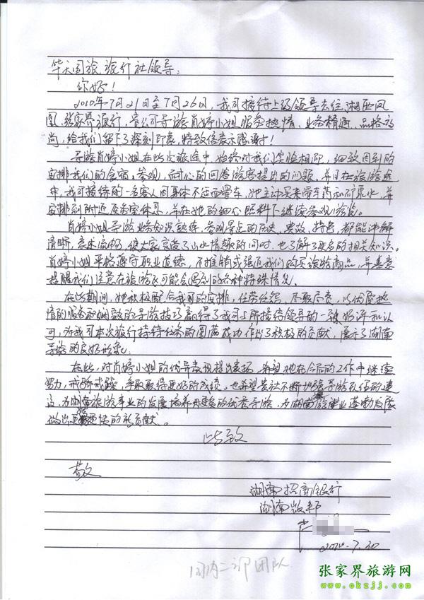 表揚信:湖南招商銀行對我社導(dǎo)游肖婷高度表揚